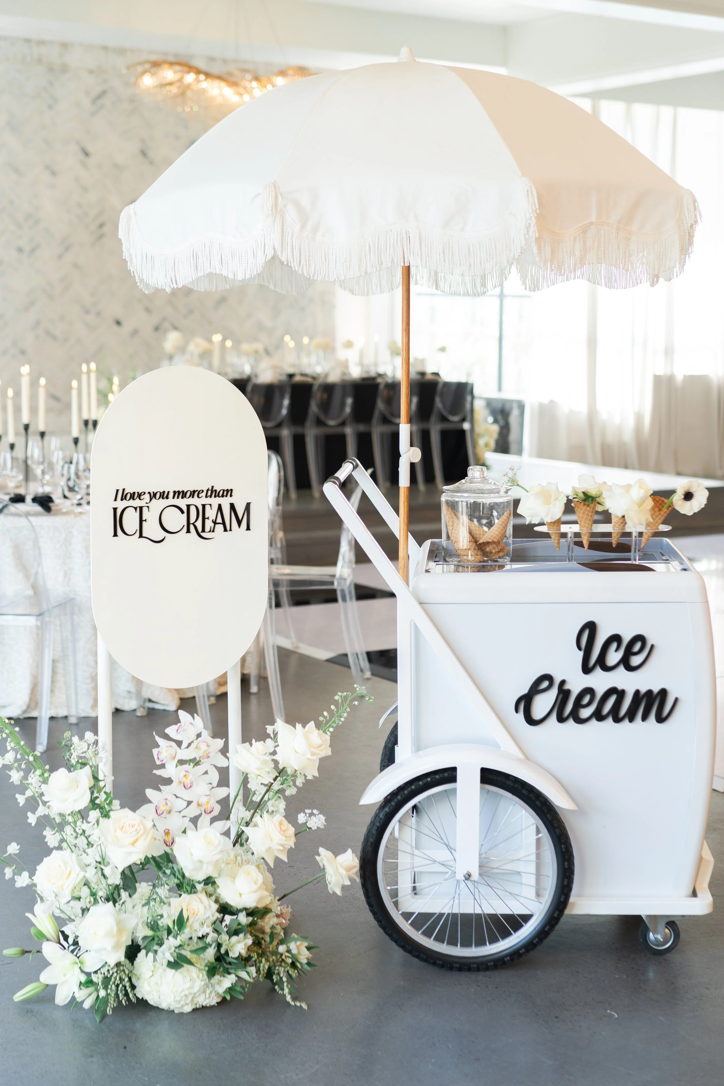 Chic cart with choice of color for the umbrella (white or pink) and ice cream sign.